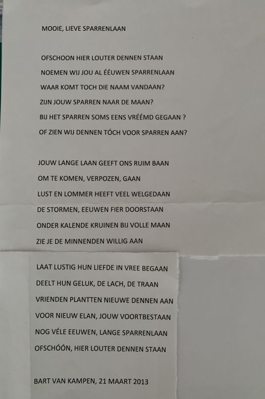 Als tuinarchitect interesseerde mij al langer een tuin aan de Beukenlaan in Bergen; ik kwam er vaak langs en in de loop van de zomer kwam er een fantastische bloei-combinatie van hogere vaste planten boven de haag uit. Op zekere dag wilde ik er toch meer van weten en belde aan. Riet opende de deur en ik zei dat ik de tuin zo paradijselijk vond en vroeg of ze wist wie die had ontworpen. Ze nodigde me naar binnen. Daar zat Bart, in een gemakkelijke stoel, natuurlijk met een vrolijk gezicht. Ik was compleet verrast. “Ga zitten” zei Bart met warme stem, en daarna hebben Riet en hij antwoord gegeven op mijn vragen - ik kreeg zelfs nog enkele foto’s van het beplantings-ontwerp. Wát een juweel van een tuin ligt daar.