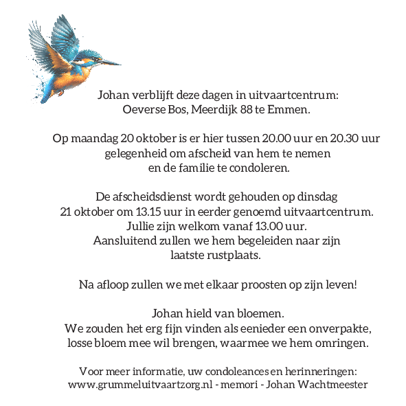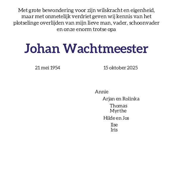 Bekijk of download de rouwkaart van Johan Wachtmeester.