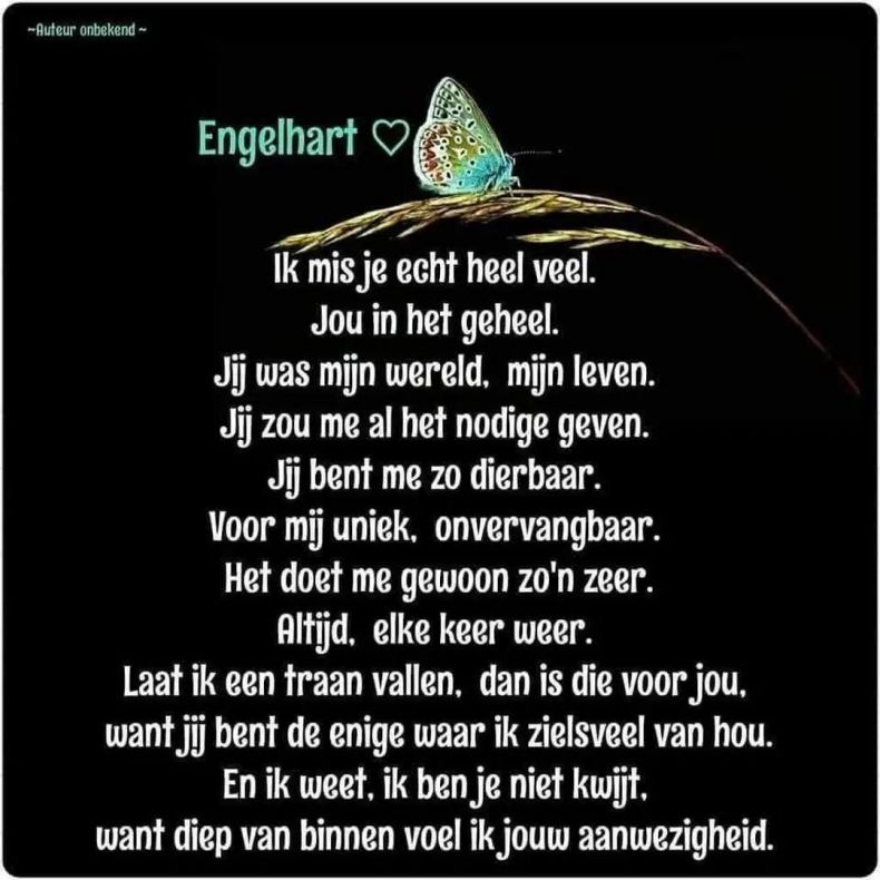 Vandaag alweer 19 jaar geleden dat ik afscheid van je heb moeten nemen. Maar er gaat geen dag voorbij of ik denk niet aan je mis je enorm. Het afgelopen jaar ben ik zelf ook ziek geweest en moest steeds aan jou denken.