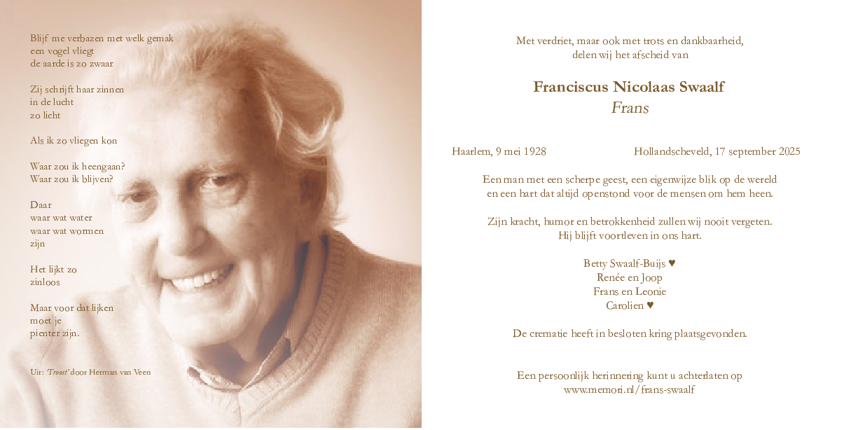 Bekijk of download de rouwkaart van Frans Swaalf.
