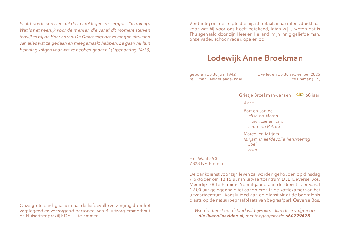 Bekijk of download de rouwkaart van Lodewijk Anne Broekman.